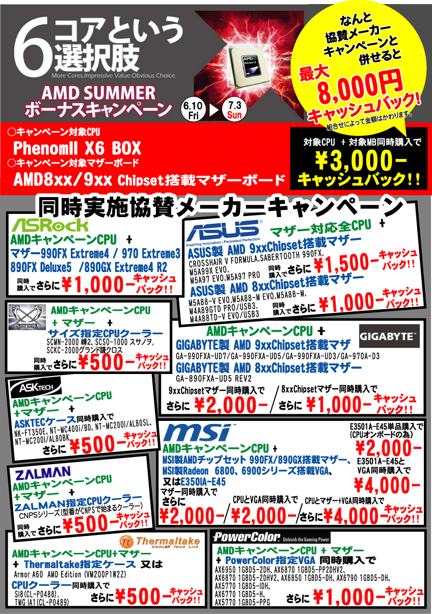 AMD PhenomII X6プロセッサとAMD 8xx/9xxチップセット搭載マザーボードとの同時購入にて,3000円のキャッシュバックです.