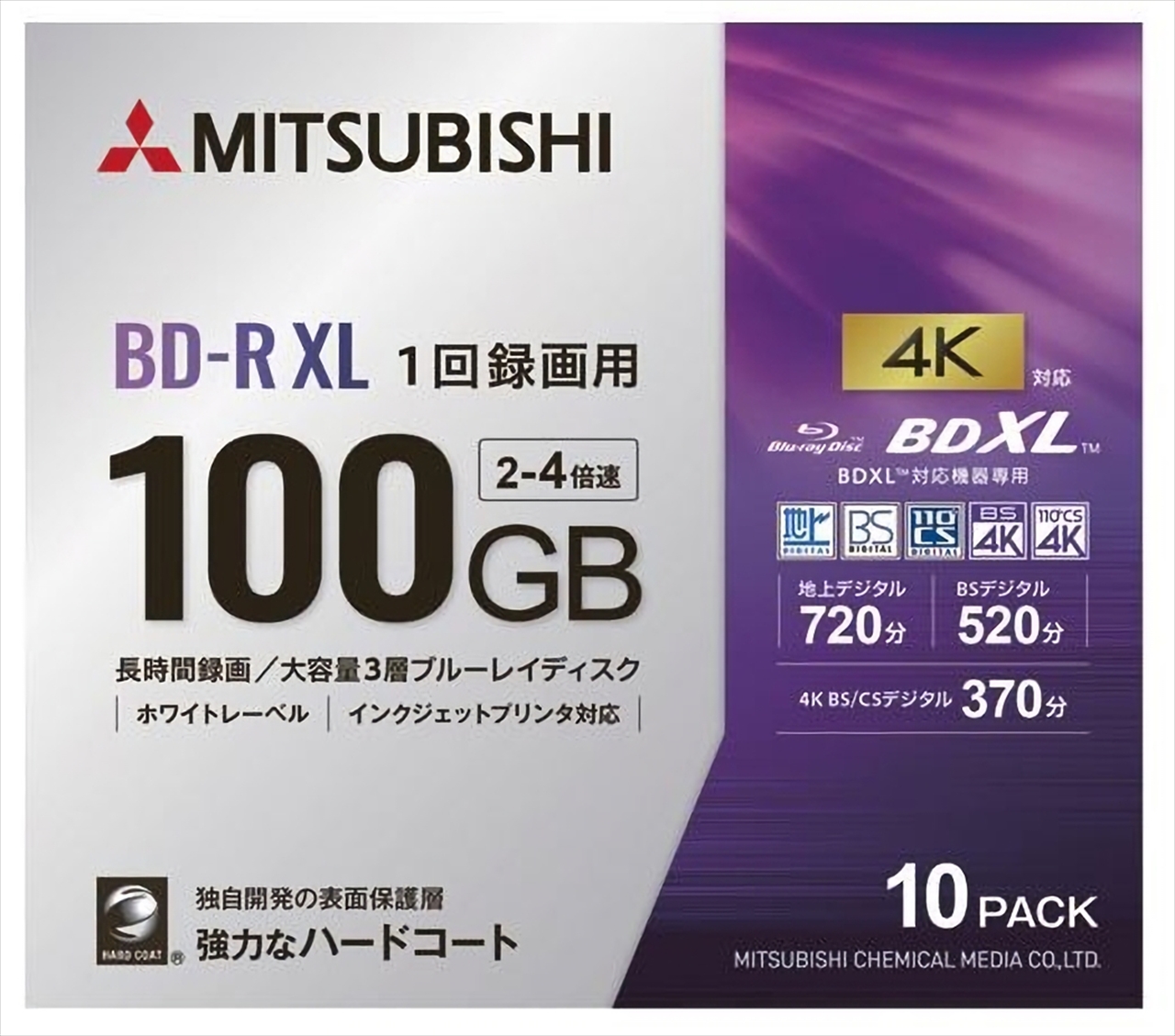初期不良交換1ヶ月対応(レシート及びパッケージ必要)、 4倍速対応、BD-R XL、1回書き込み、録画用 100GB、ホワイトプリンタブル、10枚パック、BD-R XL<片面3層> 1回記録用 100GB 2-4倍速 10枚パック