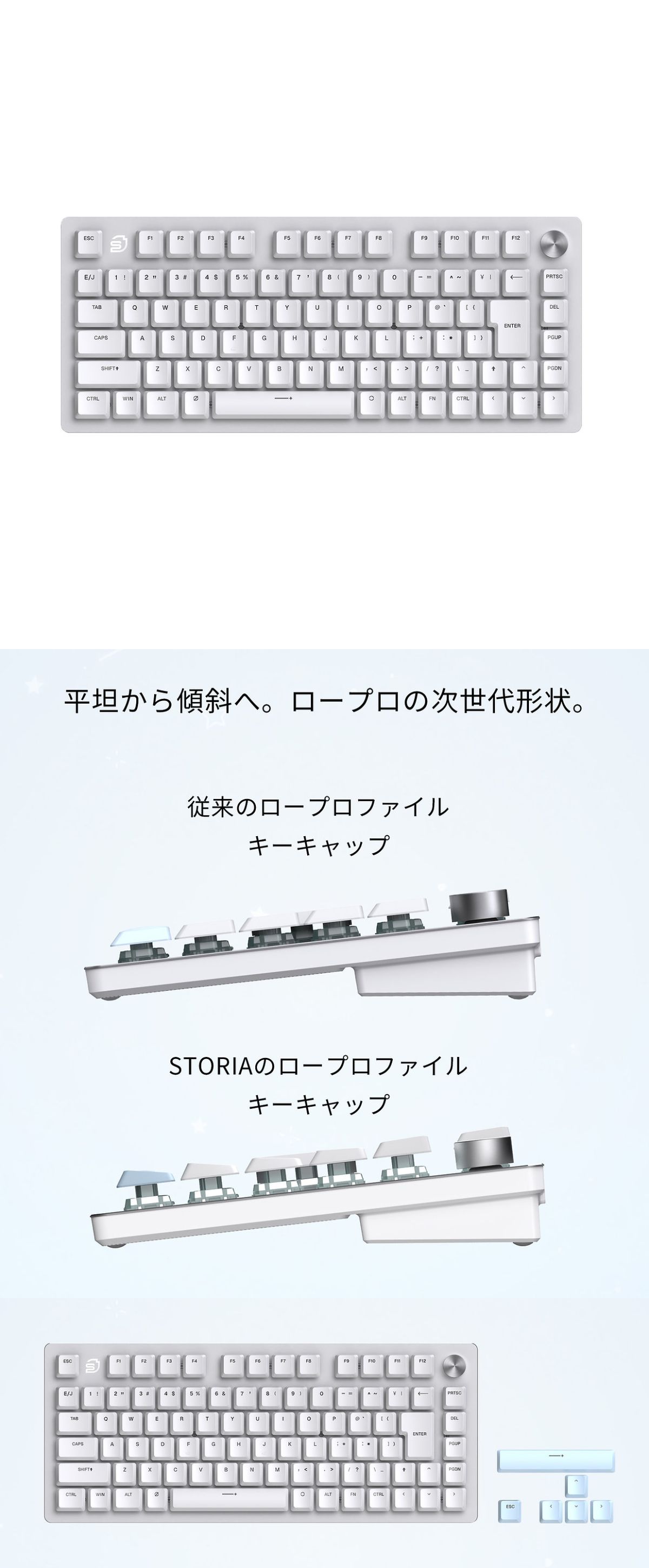 「Comet75」は軽快さ・応答性・快適性を極限まで追求した、STORIA独自のロープロファイルキーボードです。 これまでのロープロファイルは「薄いが操作性が劣る」と思われがちでした。 しかしComet75は、専用スイッチと自社開発キーキャップの組み合わせでその常識を覆します。