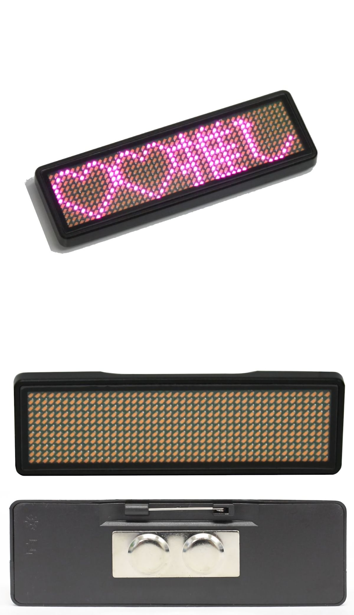 LED上に動く文字や絵文字を専用ソフトで転送して表示可能な胸ポケットに装着できるバッジです。