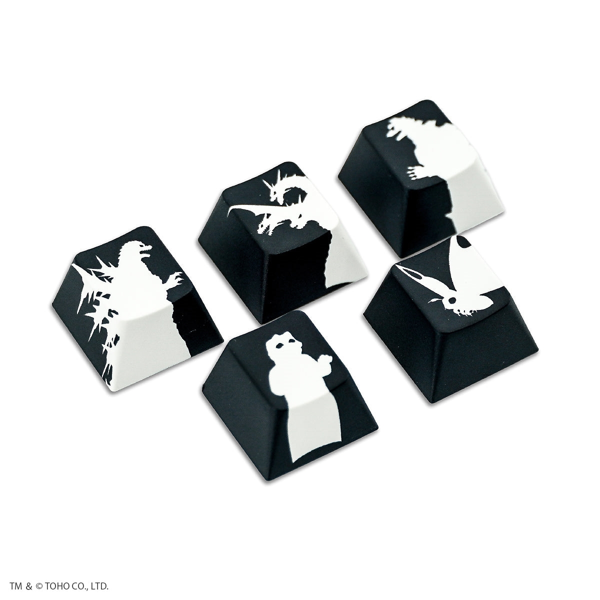 ゴジラ、キングギドラ、メカゴジラ、モスラ、ミニラのシルエットをデザインしたキーキャップセットです。