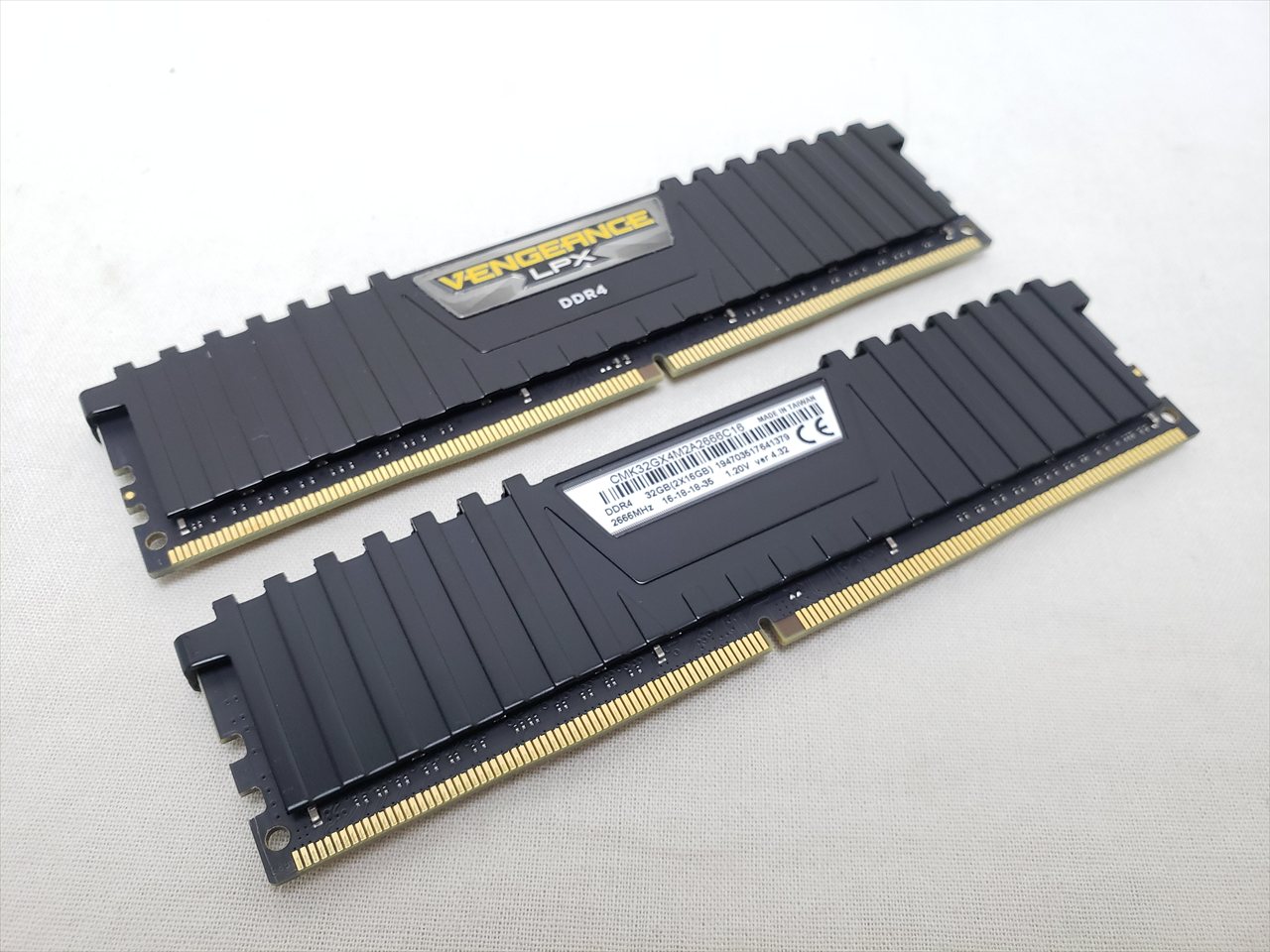 16GBx2、 中古保証3ヶ月、 288pin DDR4 SDRAM、PC4-21300、DDR4-2666、CL16-18-18-35、1.2V、XMP2.0、ロープロファイル、Dual Channelに最適な2枚組みセット、デスクトップ用