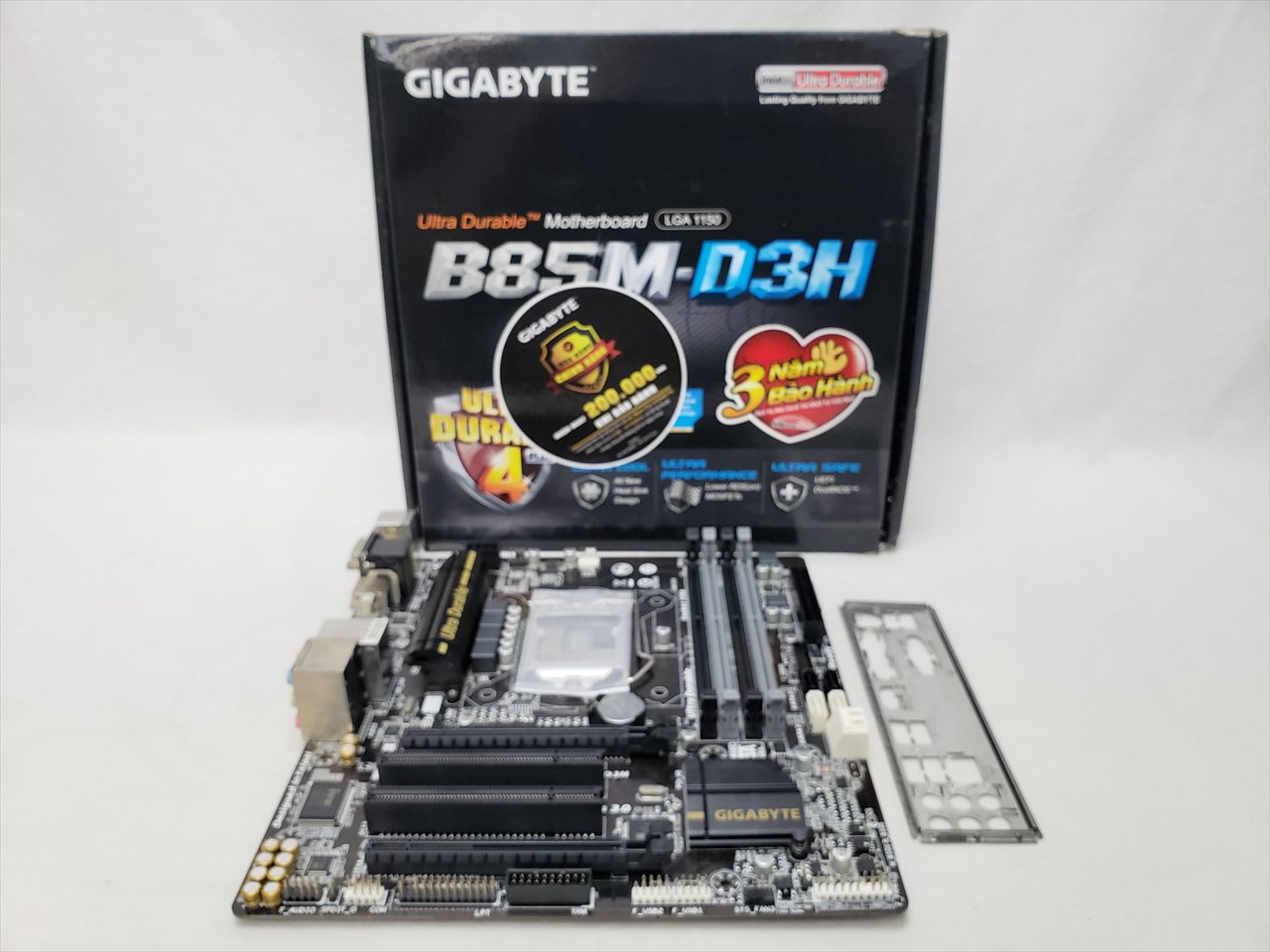 I/O端子部サビあり、箱あり、付属品I/Oシールドのみ、 中古保証3ヶ月、 MicroATX、LGA1150、Intel B85、DDR3 Dual Channel 4Slot MAX32GB、HDMI(1) DVI(1) D-sub(1)、PCI-Ex16(1) PCI-Ex1(2)、SATA3(4) SATA2(2)、Gigabit LAN(1)、HD8ch(Realtek ALC887)、メモリは4DIMM対応、3系統の出力も搭載。