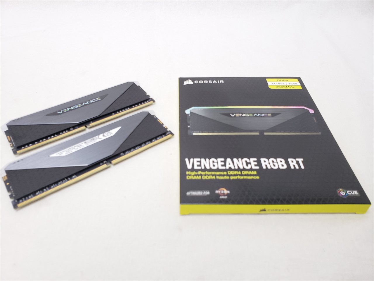 16GBx2、 中古保証3ヶ月、 288pin DDR4 SDRAM、PC4-28800、DDR4-3600、CL16-20-20-38、1.35V、XMP2.0、iCUE制御 10ZONE RGB LED、VENGEANCE RGB RTシリーズ、Dual Channelに最適な2枚組みセット