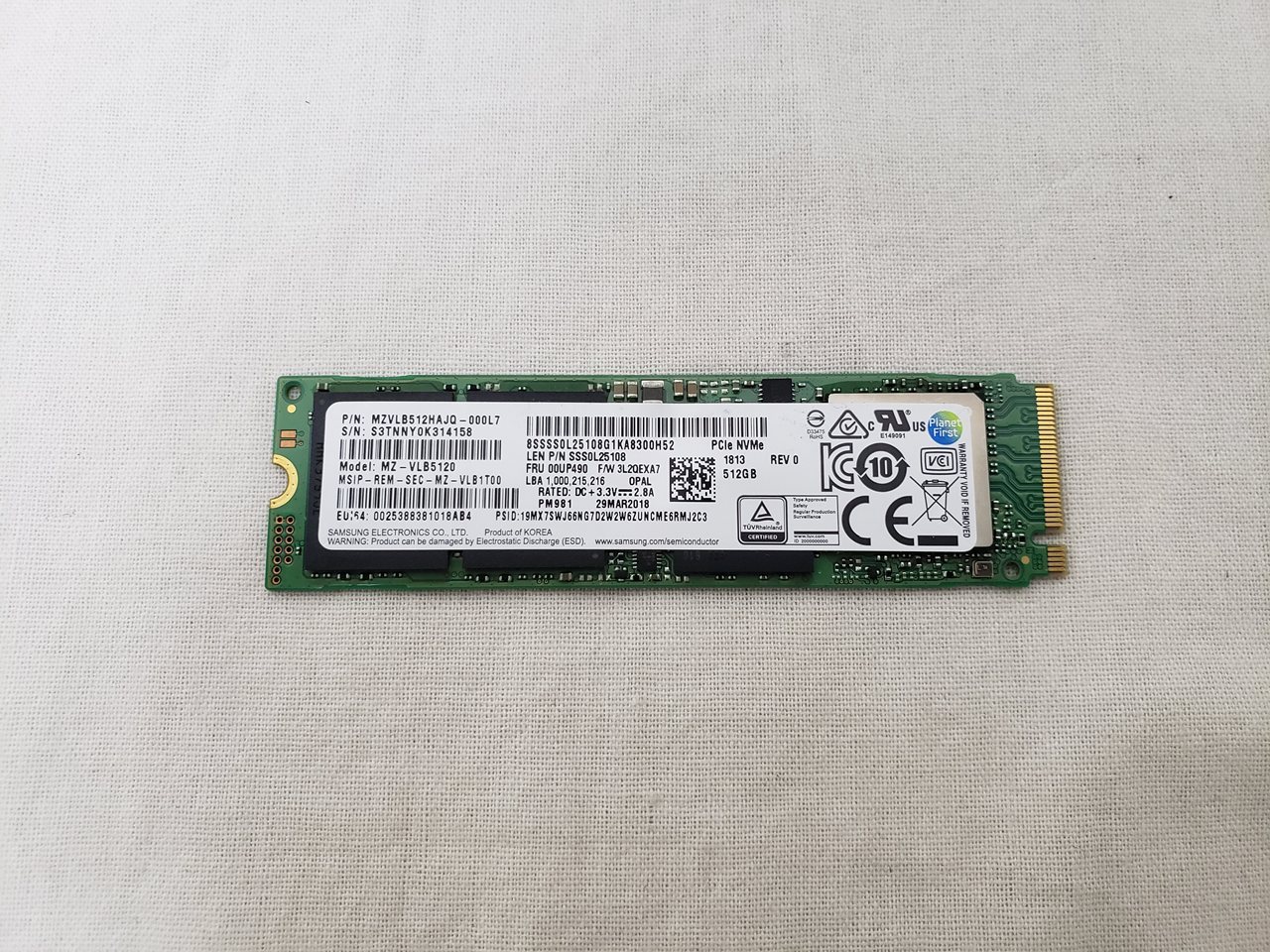 SSDのみ、 中古保証3ヶ月、 512GB、SSD、Read : 3000MB/s、Write : 1800MB/s、M.2 PCIe Gen3 NVMe、PM981