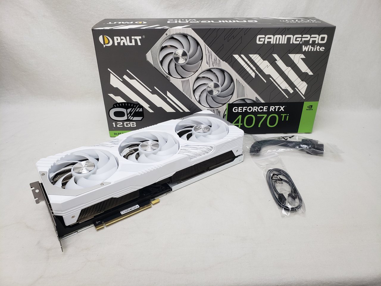 付属品あり、 中古保証3ヶ月、 PCI-Express4.0 x16、GeForce RTX 4070Ti、(Boost OC mode 2670 MHz/Default mode 2310 MHz CUDAコア7680)、12GB、(GDDR6X、21Gbps、192bit)、HDMI2.1a x1、DisplayPort1.4a x3、16-pin PCIe 12VHPWR x1 または 8pin x2