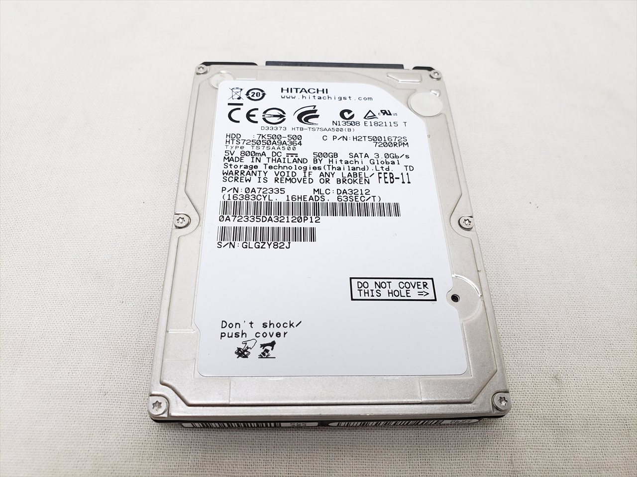 中古保証3ヶ月、 500GB、12ms、7200rpm、16MB、SATA 3G、Travelstar 7K500、2.5インチ、厚み9.5mm