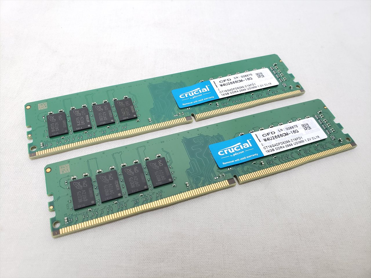 16GBx2、 中古保証3ヶ月、 288pin DDR4 SDRAM、PC4-21300、DDR4-2666、CL19、Dual Channelに最適な2枚組みセット、デスクトップ用
