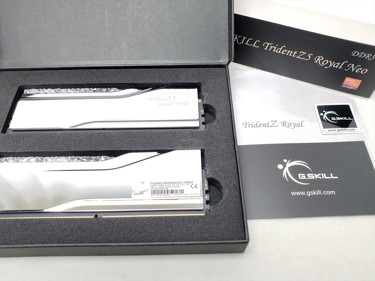 24GBx2、 中古保証3ヶ月、PCパーツ一式と同時購入で1年保証、 288pin DDR5 SDRAM、PC5-64000、DDR5-8000、CL40-48-48-128、1.4V、Trident Z5 Royal NEO RGB、AMD EXPO対応、Dual Channelに最適な2枚組みセット、デスクトップ用