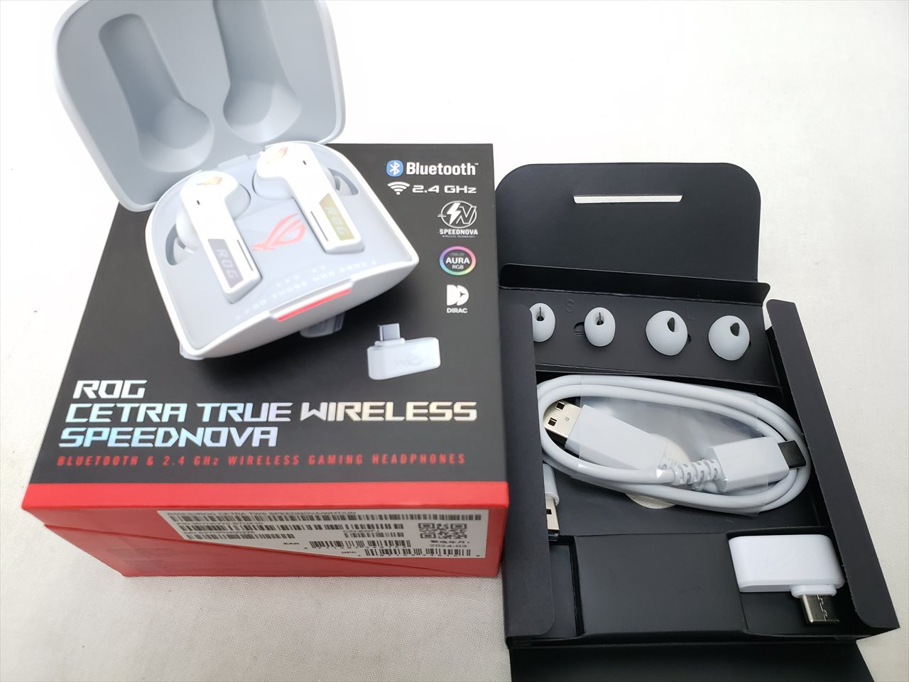 状態:B(多少使用感あり)、箱/付属品あり、 中古保証3ヶ月、 Bluetoothと2.4GHzモードの接続に対応する完全ワイヤレスゲーミングイヤホン。各モードで2台のデバイスを同時にペアリング可能。最大46時間持続バッテリー、高解像度オーディオ、骨伝導AIマイク、ANC機能(自動モード搭載)、ASUS Aura RGB対応