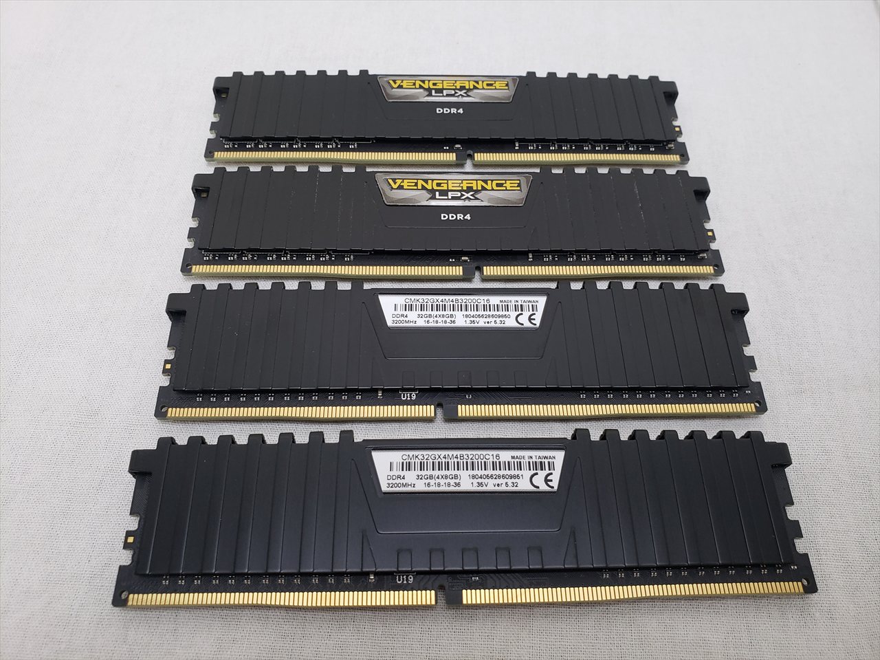 8GBx4、 中古保証3ヶ月、PCパーツ一式と同時購入で1年保証、 288pin DDR4 SDRAM、PC4-25600、DDR4-3200、CL16-18-18-36、1.35V、XMP2.0、ロープロファイル、Quad kit(4枚組み)、デスクトップ用